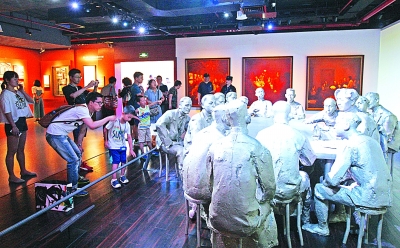参观者在上海中共一大会址纪念馆观看再现中共一大会场的情景雕塑。新华社发