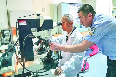 图为崔道植(左)在进行痕迹检验工作。新华社发