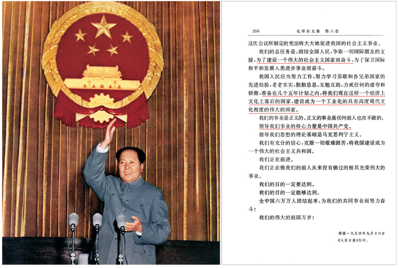 左图为毛泽东同志在第一届全国人大第一次会议上致开幕词;右图为毛泽东同志在开幕词中的重要论述。