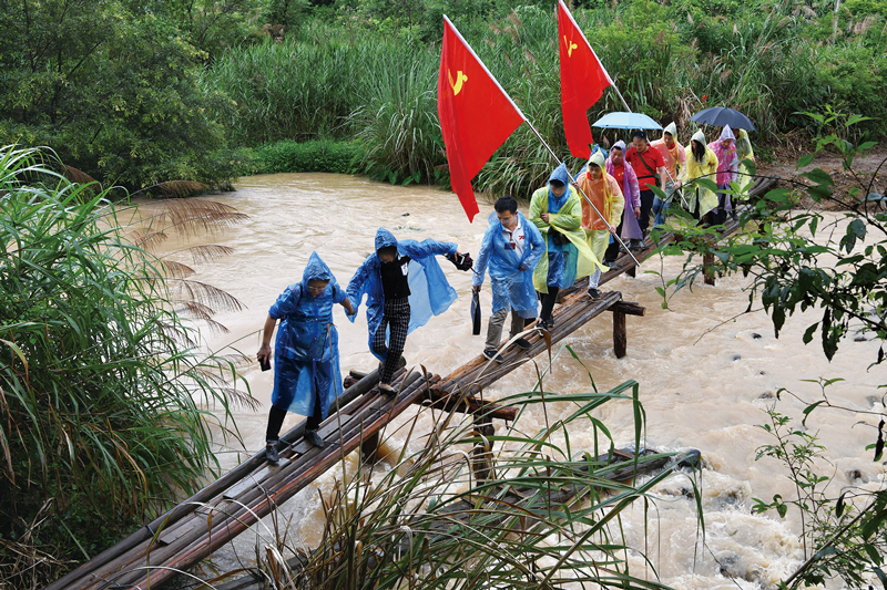 2019年6月11日至8月18日,中央宣传部组织开展了“壮丽70年·奋斗新时代——记者再走长征路”主题采访活动,先后有1300余名记者追随当年红军长征步伐,深入实地采访,累计跨越16000余公里,推出10000余篇鲜活生动、形式多样的报道,网上总阅读量近20亿次。习近平总书记近日对“记者再走长征路”主题采访活动作出重要指示强调,中央宣传部组织开展的“记者再走长征路”主题采访活动,生动再现壮怀激烈、惊天动地的革命故事,对阐释用生命和鲜血铸就的伟大长征精神很有意义。图为6月13日,参加主题采访活动的记者们,在江西于都县祁禄山沿着当年中央红军长征走过的“红军小道”冒雨行进,体验红军穿越深山峡谷的艰苦行程。 经济日报记者 刘兴/摄