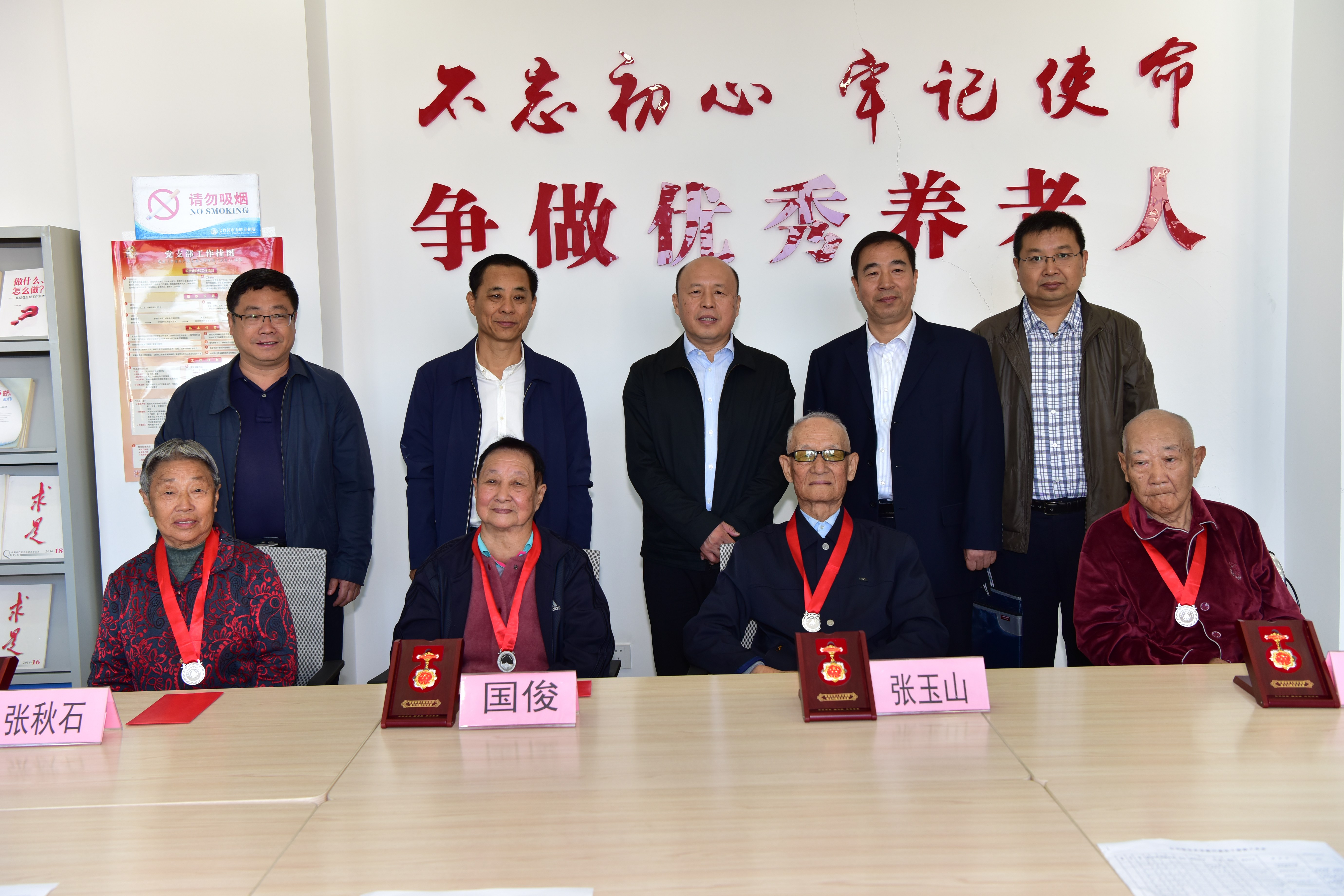 张长山等领导还深入春晖养老院看望慰问了孟宪章、张玉山、国俊、张秋石,为他们送去了节日的祝福和组织的关怀,对他们为国家建设和企业发展做出的贡献给予高度评价,为他们颁发发“庆祝中华人民共和国成立七十周年纪念章”和七台河公司颁发的矿区开拓者银质奖章、矿区开拓者奖金,叮嘱他们要保重身体,祝愿他们晚年幸福美满。