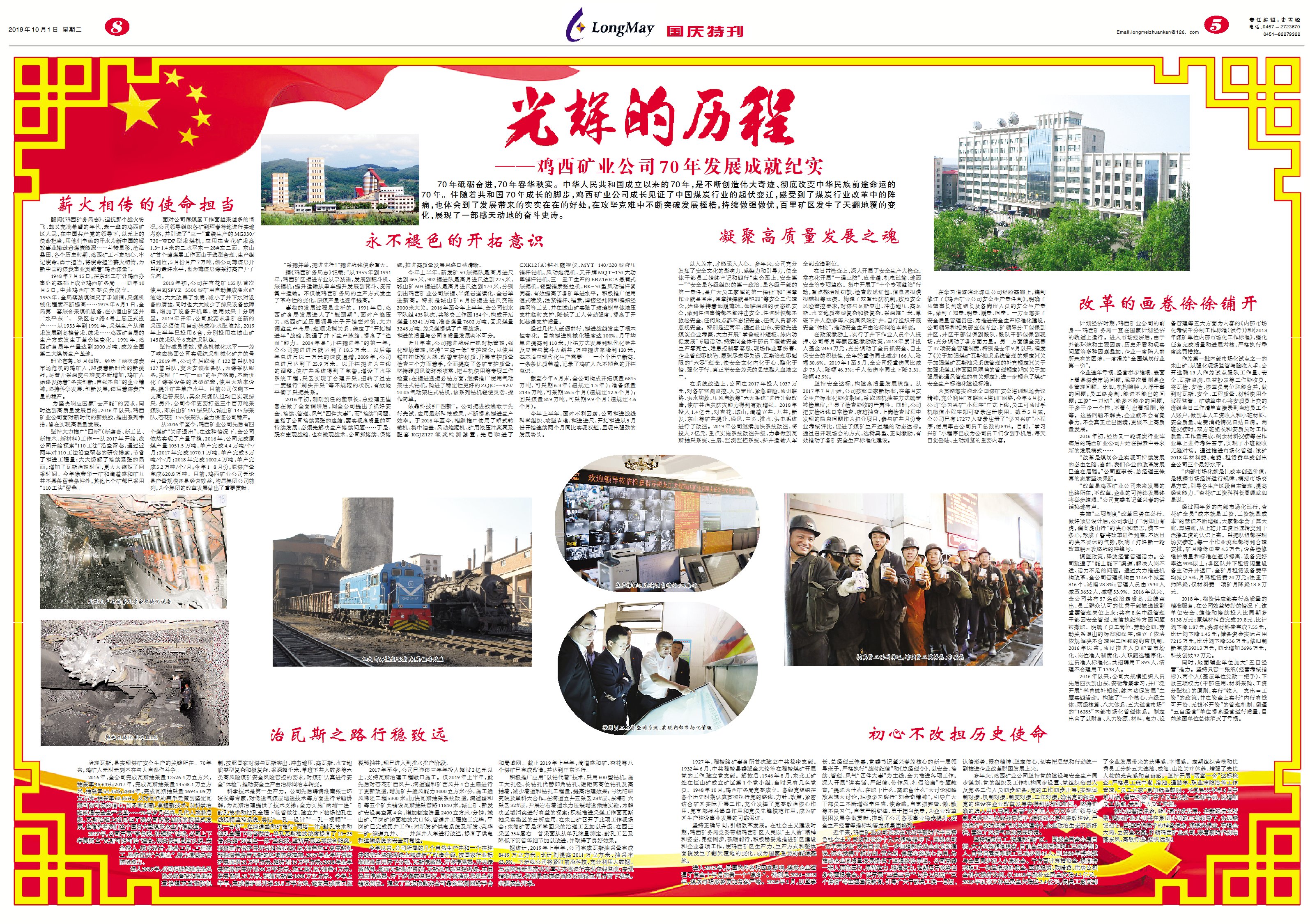 70年砥砺奋进,70年春华秋实。中华人民共和国成立以来的70年,是不断创造伟大奇迹、彻底改变中华民族前途命运的70年。伴随着共和国70年成长的脚步,鸡西矿业公司成长见证了中国煤炭行业的起伏变迁,感受到了煤炭行业改革中的阵痛,也体会到了发展带来的实实在在的好处,在攻坚克难中不断突破发展桎梏,持续做强做优,百里矿区发生了天翻地覆的变化,展现了一部感天动地的奋斗史诗。