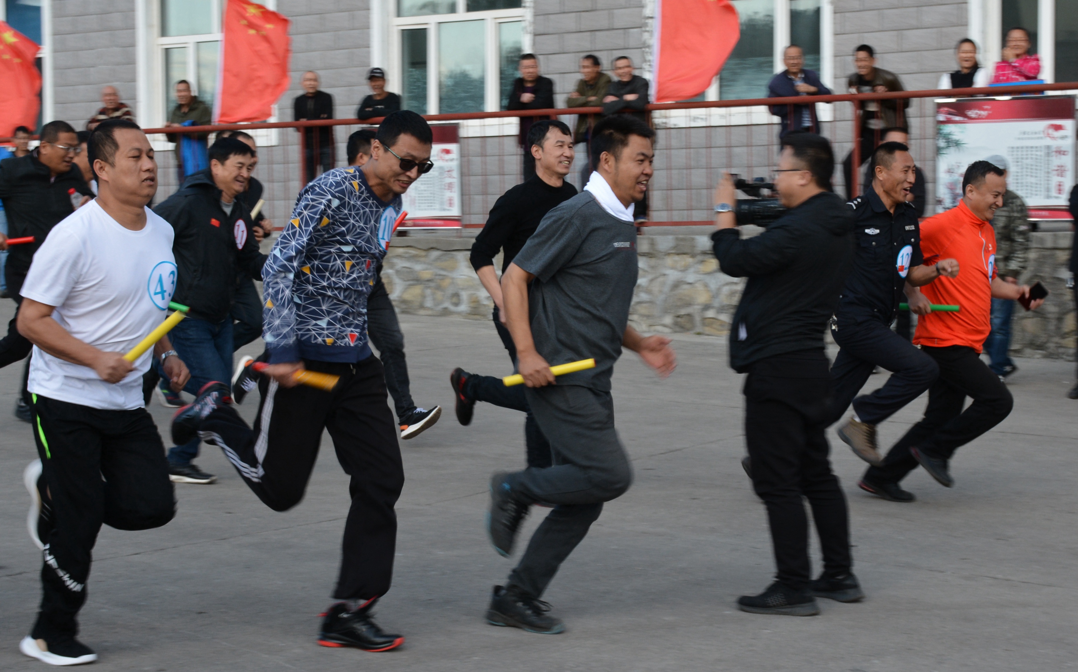 20支参赛队伍每人手持小国旗,身贴国旗贴,共同合唱《我和我的祖国》。比赛采取接力跑的形式,每组7人,每人跑完1000米后将接力棒交到队友手中,全程共7000米,运动队员们互相团结,拼搏奋进,成为赛道上一道壮丽的风景线。
