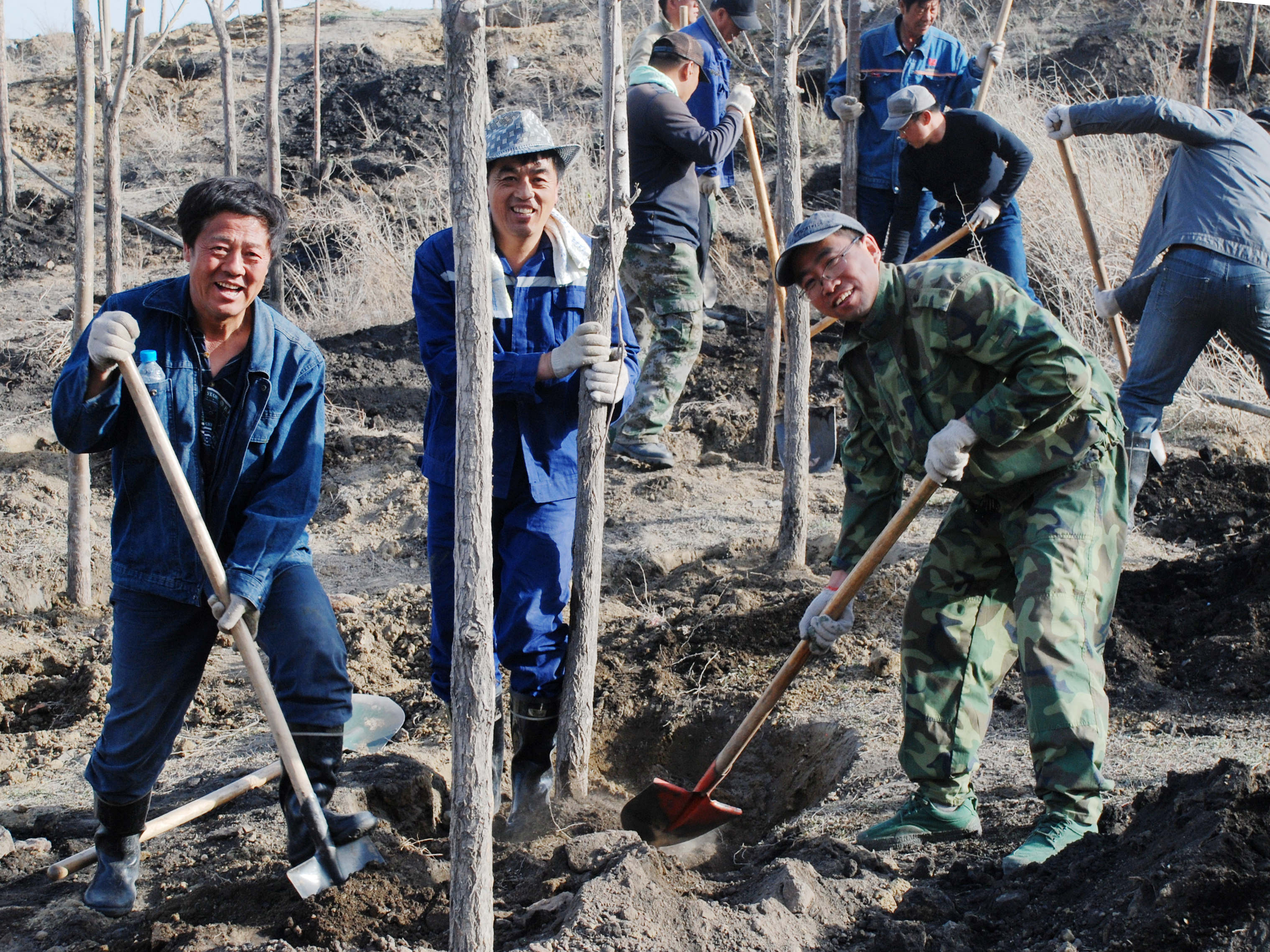 图为2011年初春,新疆公司机关干部义务献工参加西山煤矿植树绿化活动。