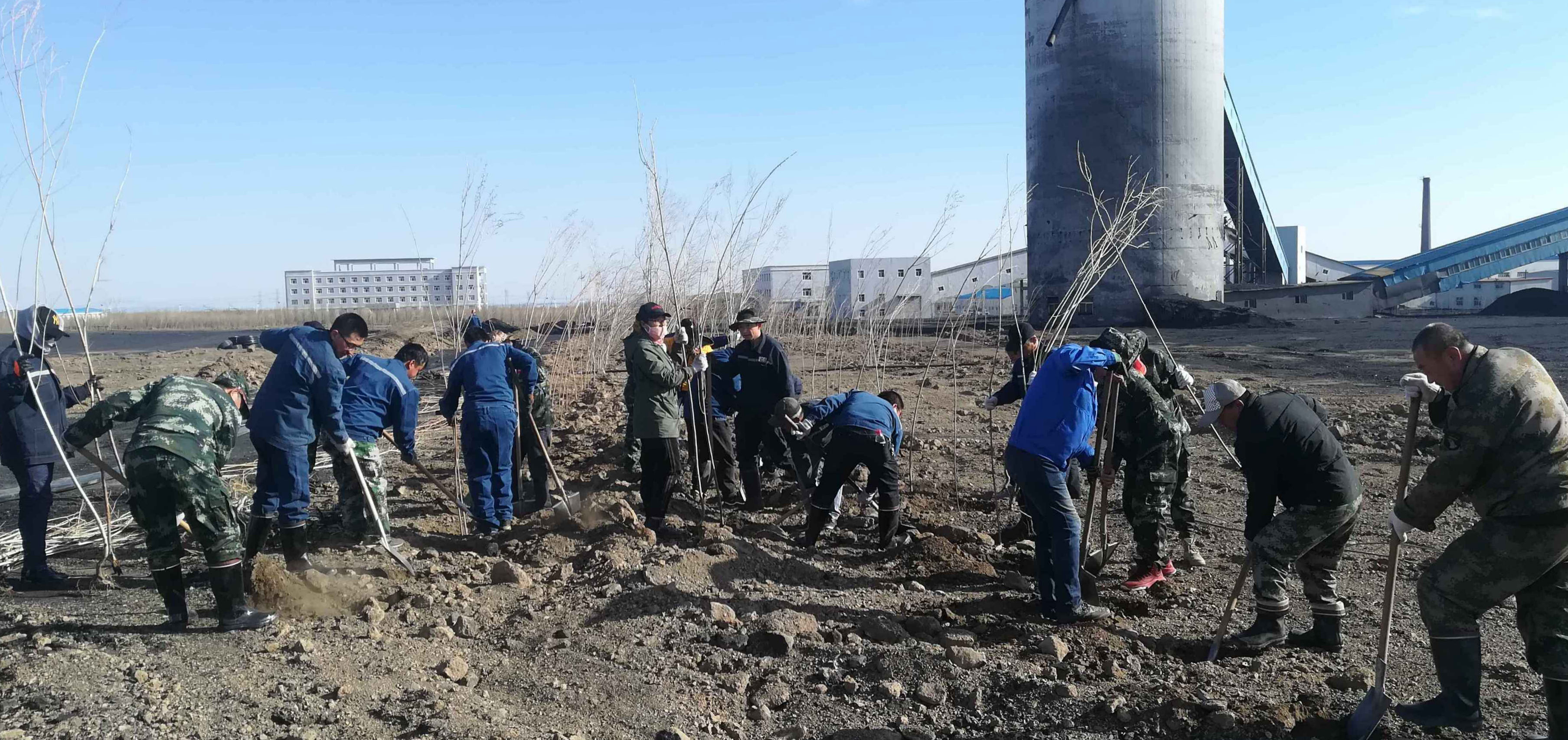 图为黑眼泉煤矿干部职工利用工休工余时间在荒漠中植树造林。