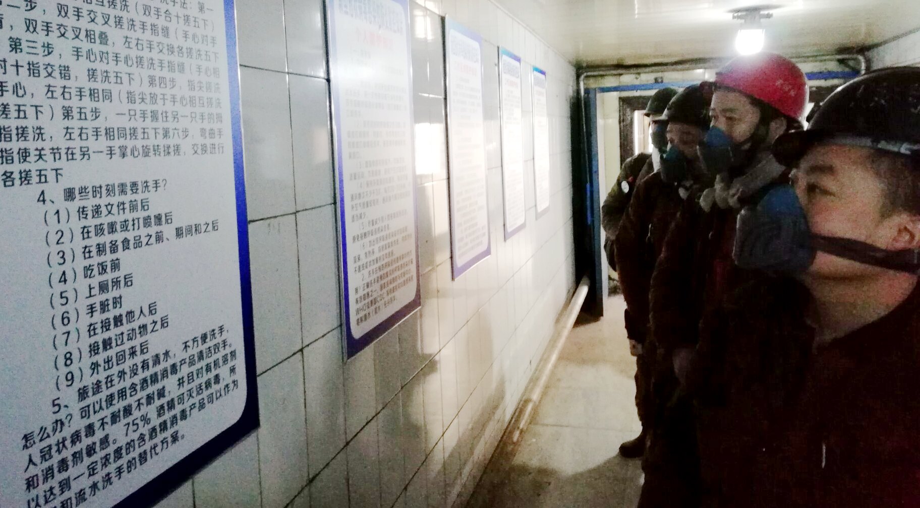 新陆矿在入井长廊悬挂牌板,对矿工进行个人防护知识宣传