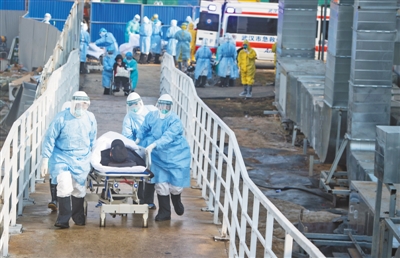 近日,医护人员将患者转运至武汉火神山医院病房。新华社记者 肖艺九摄