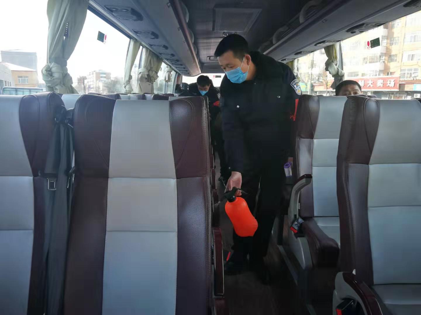 早上6点,在东荣小区站前广场上,东荣二矿保卫科干警一边为职工测体温,一边有条不紊的组织职工上车,保持距离坐好。