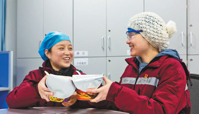 2月9日,中南大学湘雅二医院援鄂医疗队护士周杰楠(右)在武汉度过了29岁生日。在紧张的工作间隙,她与同样是当天过生日的同事曾艳一起吃方便面当做庆祝。人民日报记者 张武军摄