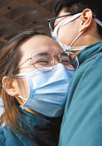 河南省直第三人民医院的刘光耀(右)和乔冰是一对“90后”情侣,一起报名参加援鄂医疗队。2月2日,医疗队出发前,两人拥抱着相互鼓劲。新华社记者 李 安摄