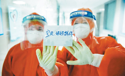 在湖北省十堰市郧阳区人民医院感染科,28岁的护士焦娇坚守在隔离病区,偶尔才能与3岁的女儿视频通话。图为焦娇(左)与同事将写有“宝贝,妈妈想你”的纸条贴在玻璃上。周家山摄(人民视觉)