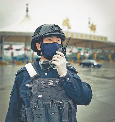 四川成都市青羊区公安分局民警杨桐今年28岁,新婚不久的他投入防疫一线,在高速公路收费站执勤,每天平均盘查1000余台车辆,为2600余人测量体温。图为2月12日,杨桐在岗位上通过对讲机与同事沟通工作。人民日报记者 王明峰摄