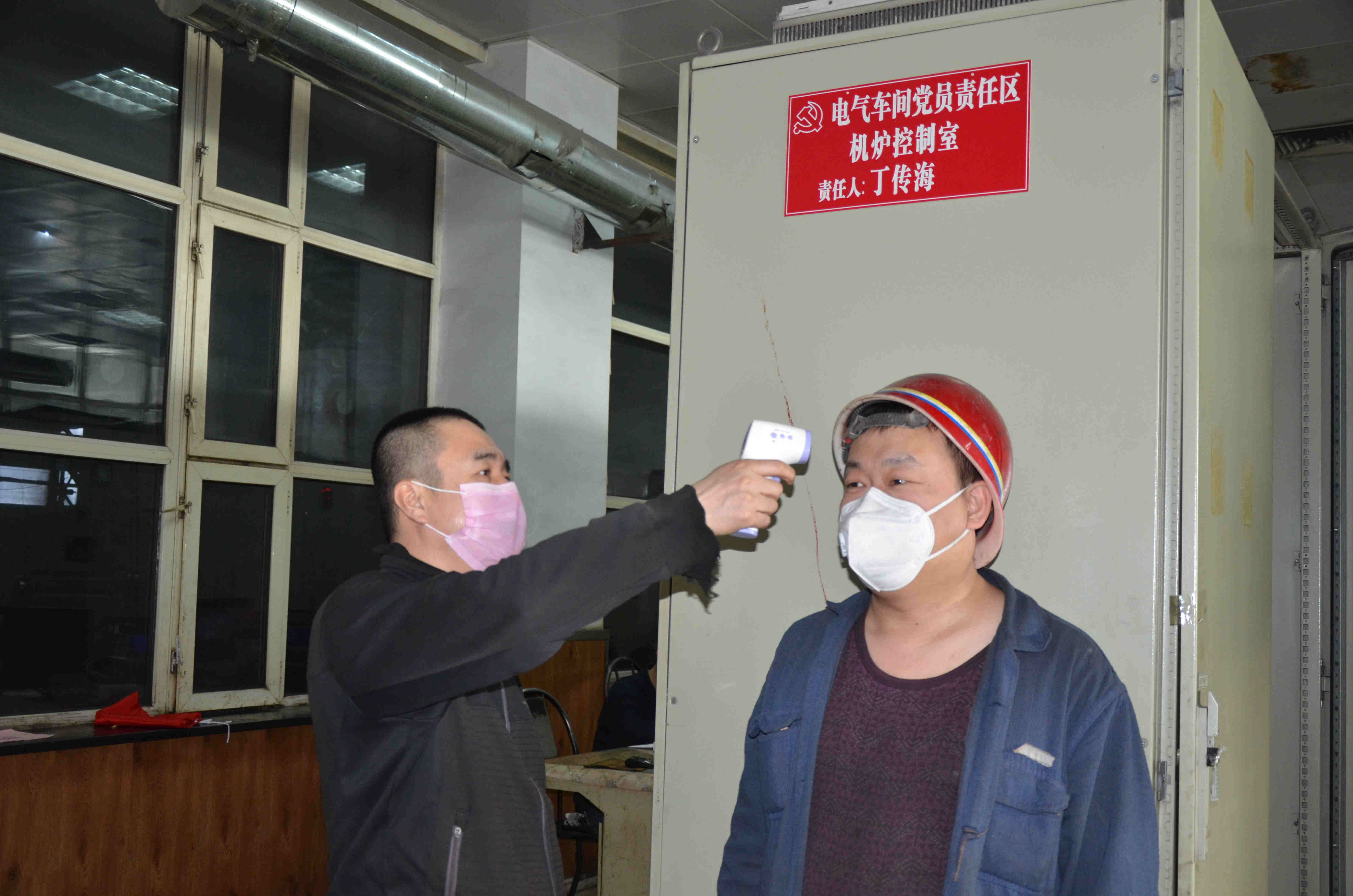 七台河公司热电厂锅炉车间党员班长王培军,疫情期间坚持每班为职工监测体温,耐心叮嘱职工“勤洗手、戴口罩、休息好、兑规作业”,职工亲热地称呼他是“健康管家”。(王贤宝 摄)