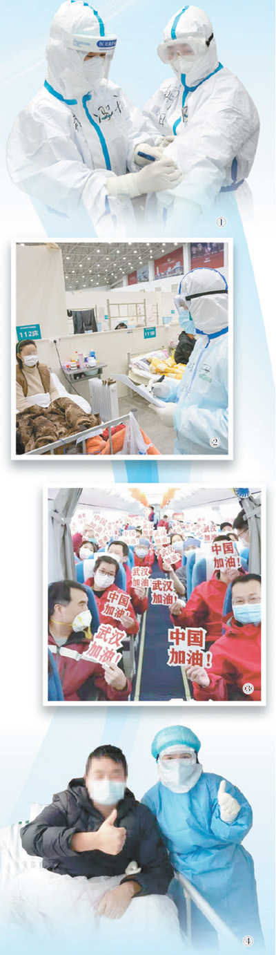 图④:山东医疗队护士孙宪洁(右)与即将出院的患者合影。