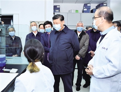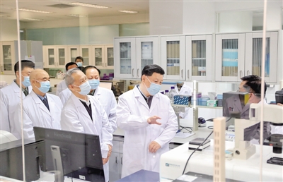 2日下午,习近平首先来到军事医学研究院,听取研究院关于新冠肺炎疫情防控科研攻关的总体情况汇报,结合展板和实物了解疫苗和抗体研制、药物筛选、病毒致病机理研究、快速检测试剂研究和应用等进展情况。在仪器测试楼,习近平察看了重大疫情应急防控药物研究室,向坚守岗位、奋力攻关的一线专家和科研人员表示亲切慰问。他强调,提高治愈率、降低病亡率,最终战胜疫情,关键要靠科技。习近平指出,新冠肺炎疫情发生以来,军事医学研究院坚决贯彻党中央和中央军委决策指示,闻令即动、争分夺秒,集中力量展开应急科研攻关,取得了阶段性成果,充分展现了人民军队忠于党、忠于人民的政治本色和敢打硬仗、善打胜仗的优良作风。习近平希望他们再接再厉,充分发挥突击队和主力军作用,尽快研制出安全有效的疫苗、药物、检测试剂,全力满足抗击疫情需要。要坚持在疫情可溯、可诊、可防、可治、可控方面合力攻关,通过打这场硬仗,掌握更多具有自主知识产权的核心科技,拿出更多硬核产品,为维护人民生命安全和身体健康、维护国家战略安全作出更大贡献。
