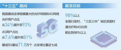 “十三五”期间,我国电信普遍服务深入推进,共支持农村和边疆地区13万个行政村通光纤和超过5万个4G基站建设。截至目前,全国行政村、“三区三州”地区贫困村通光纤和4G比例都达到98%以上。