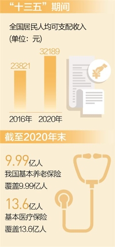 “十三五”期间,我国民生保障力度不断加大。基本养老金连续多年调整,退休人员获得感、幸福感、安全感持续增强。截至2020年末,我国基本养老保险覆盖9.99亿人,基本医疗保险覆盖13.6亿人,织成了一张世界最大的社会保障网。