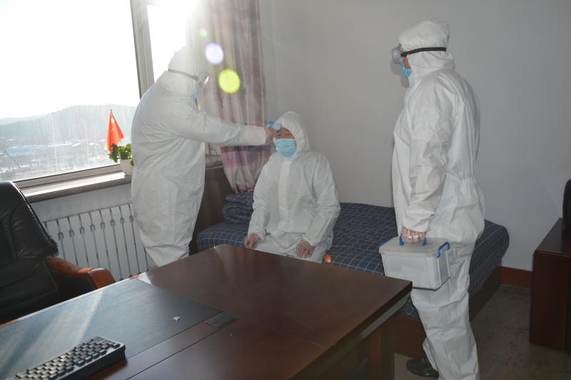 演练开始,党员督察队在日常检测办公人员体温时发现有一名职工体温超过37.2度,检查人员第一时间向上级报告,并进行应急处置,将体温异常职工带到隔离室隔离,对行动轨迹进行调查询问,通知120救护车转运,对办公场所进行全面消杀,完成从发现、隔离、观察到转运之间的各个环节。