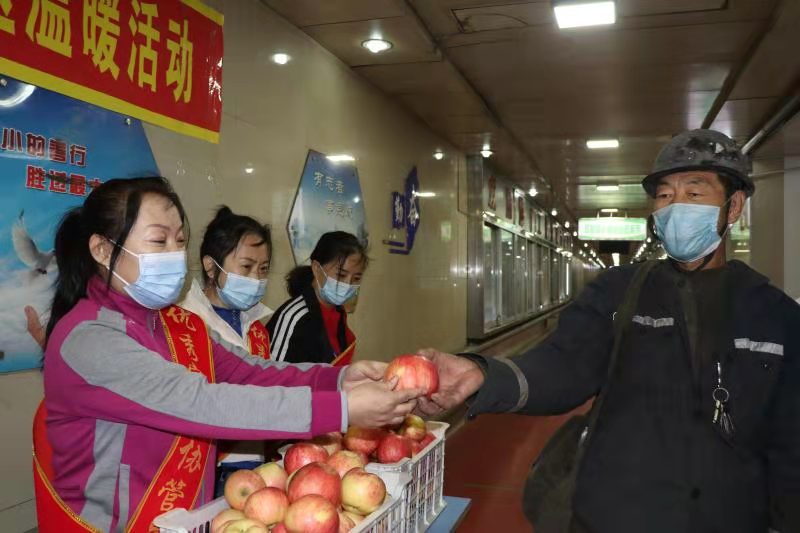 清晨5时,双阳矿女工委组织女工家属早早来到矿区入井走廊,拆箱、去包装、擦苹果,在职工入井必经之处挂条幅、放音乐,将一箱箱象征着“平安健康”的红苹果摆放整齐,播放的《大中华》《今天是个好日子》《三百六十五个祝福》……动感十足的音乐活跃了入井走廊的气氛。