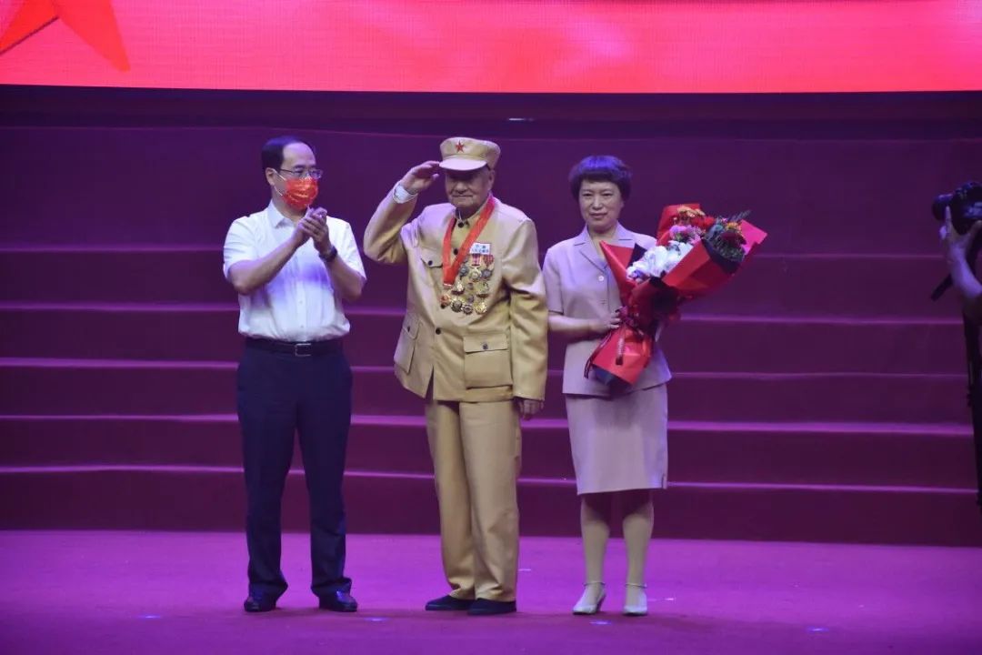 当“在党五十年”荣誉获得者,刘吉庆老人代表获奖者走上舞台接受大会表彰时,一身戎装、满身勋章的老人挺拔地站在台上向所有参会人员敬了一个标准的军礼,与会人员掌声经久不息。