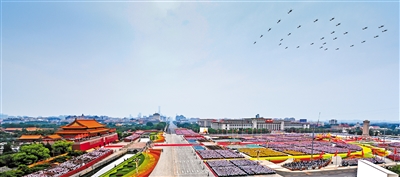 雄鹰翱翔,振翅长空。7时55分许,中国人民解放军71架战机飞向天安门广场,向党致敬,向祖国致敬,向人民致敬。空中护旗梯队拉开飞行庆祝表演序幕,5架直升机分别悬挂中国共产党党旗和写有“伟大的中国共产党万岁”“伟大的中国人民万岁”“伟大的中华人民共和国万岁”“全国各族人民大团结万岁”的条幅迎风向前。随后,直升机、战斗机分别组成“100”“71”字样掠过长空,15架歼—20飞机组成3个梯队呼啸而过,教练机拉出10道彩烟,精彩的表演激起一阵阵欢呼声。