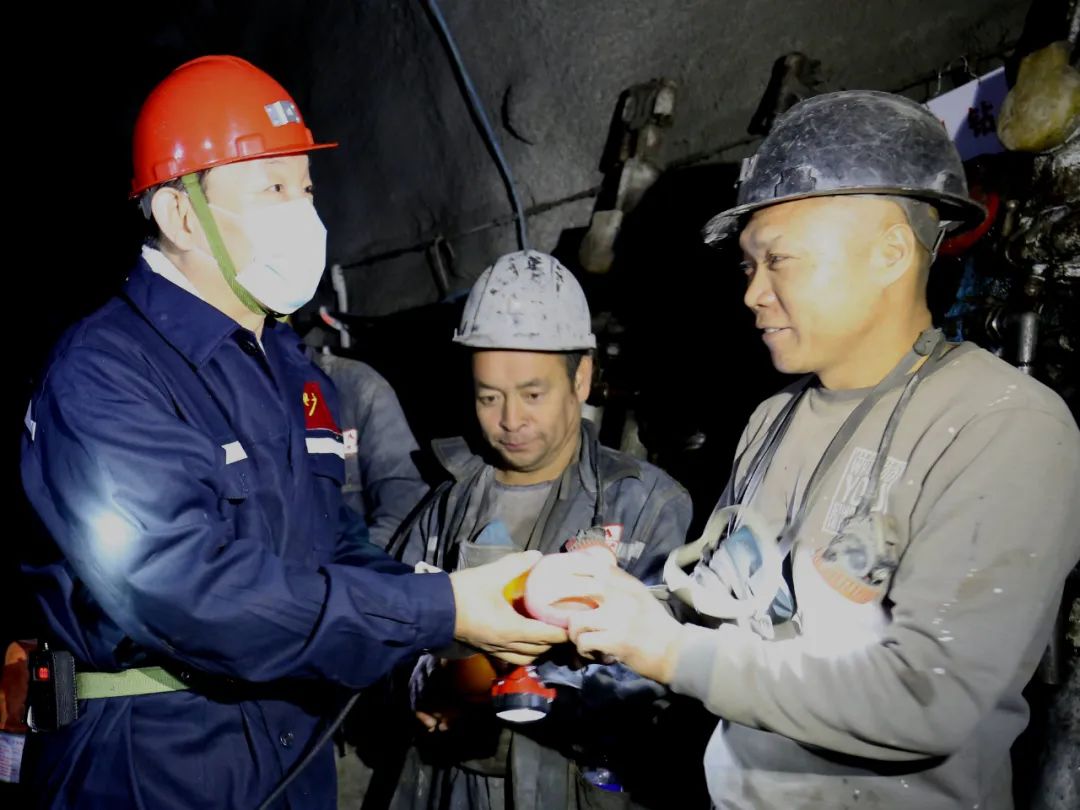 王佳喜重点检查了东山矿新风井和矿建公司2201掘进队负责施工的五采里轨道运输石门工程质量和现场管理工作。在工作面,王佳喜把“平安果”发放到每一位矿工手中,并为节日期间依然坚守岗位的矿工们送上了节日的问候与祝福。