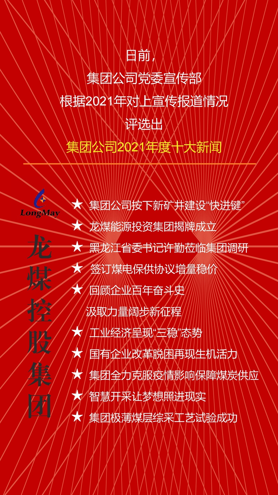 消息先后被人民网、央广网等70余家主流媒体转载报道,并入选《中国煤炭报》2021年煤炭企业十大新闻。