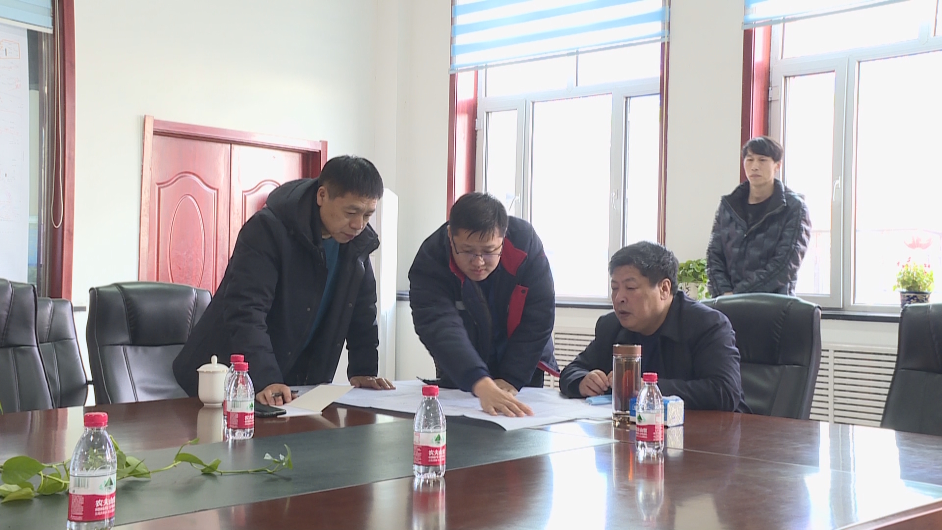 在东荣三矿安全生产指挥中心,宫延明听取了该矿改扩建项目进展、盾构机始发硐室设计、安装人员培训等方面情况汇报,并查看了设计图纸,详细了解相关工作情况。