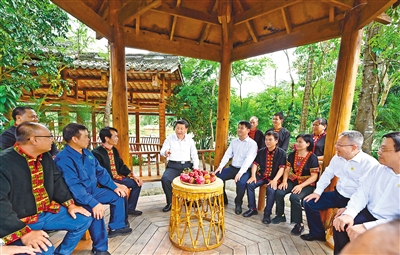 4月10日至13日,中共中央总书记、国家主席、中央军委主席习近平在海南考察。这是11日下午,习近平在五指山市水满乡毛纳村,同当地干部群众亲切交谈。新华社记者 李学仁摄