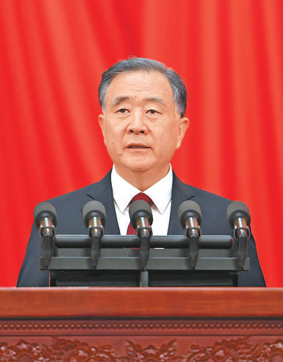 下午3时,王沪宁宣布大会开幕,全体起立,高唱中华人民共和国国歌。