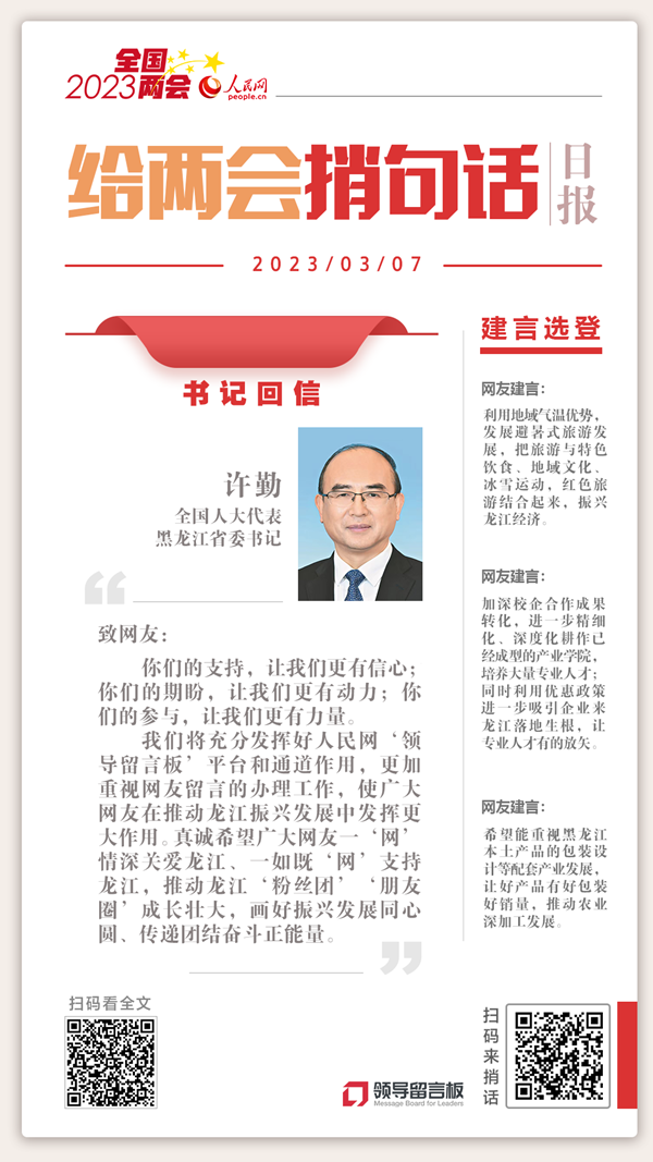 人民网2023年度“我给两会捎句话”建言征集活动正在进行,广大网友关注并积极参与。近日,黑龙江省委书记许勤通过人民网致信网友,回应群众关切。