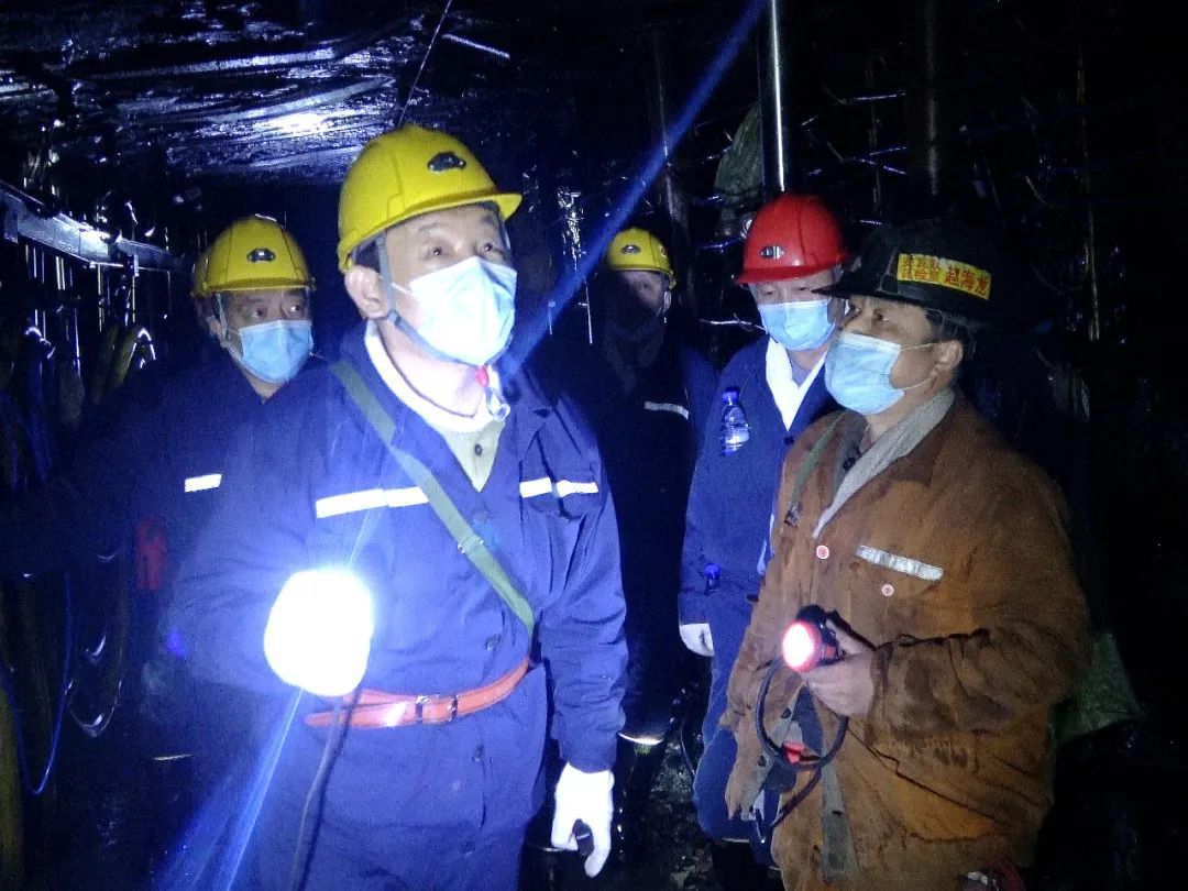 在双阳矿西一采区薄煤层工作面,王佳喜检查了综采工作面智能监控中心、顶板管理、煤层高度、采面生产条件等情况,听取了当班瓦检员和相关人员现场工作情况汇报。