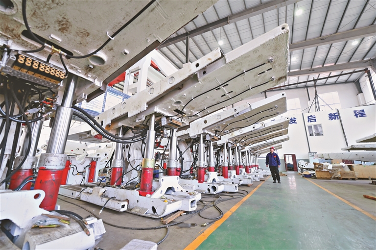 在极薄煤层液压支架的研发地和生产地——beat365双鸭山矿业双煤机电公司的生产车间,液压支架整齐排列,吊车正在有序装车,准备发往东保卫矿。
