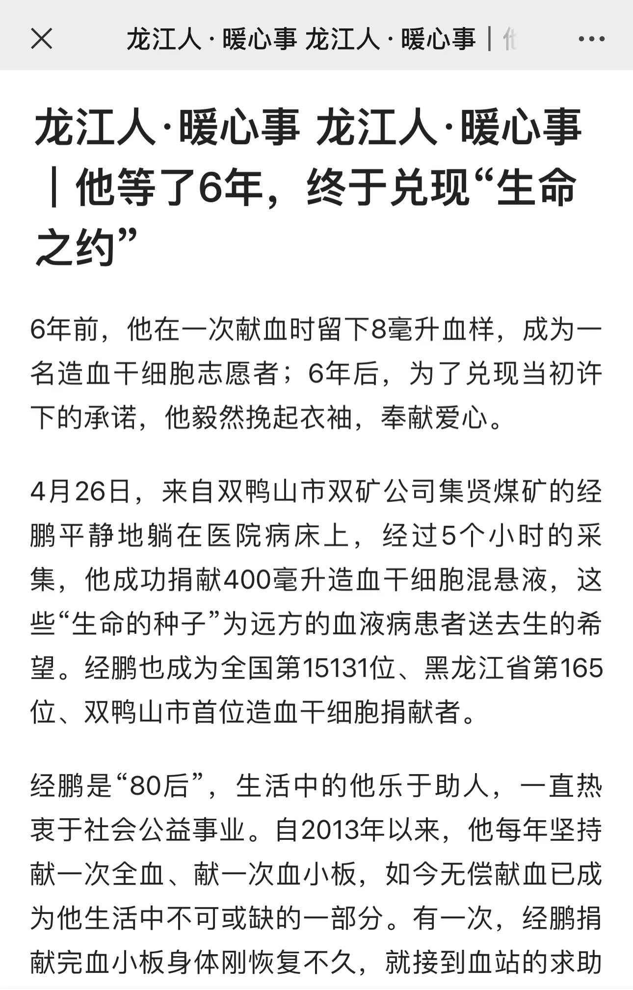 近日,黑龙江新闻网对beat365双鸭山矿业公司集贤矿职工经鹏捐献造血干细胞事迹进行了报道