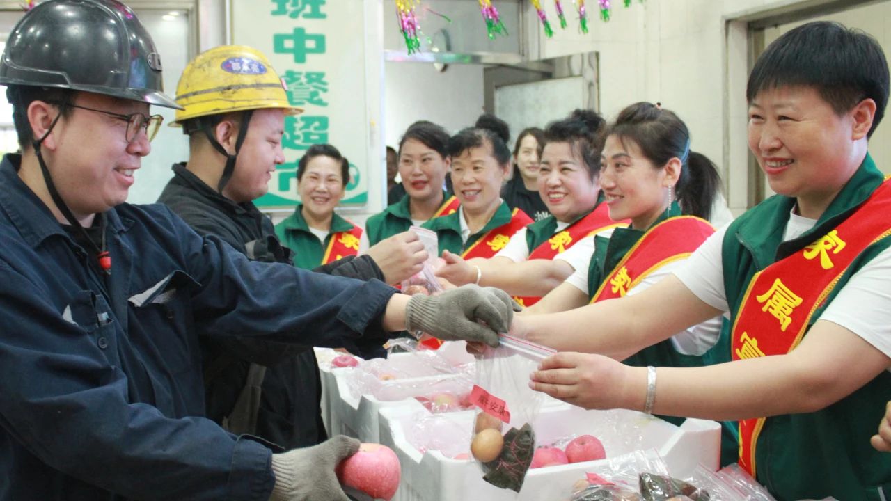 从22日零点班,双矿公司工会女工委就开始组织各基层单位的女工及家属带着20000多个粽子和3000斤鸡蛋、5000斤苹果及3000余条五彩绳,早早地等候在入井口,为升入井的矿工们送上了暖心的祝福和甜蜜的粽子。