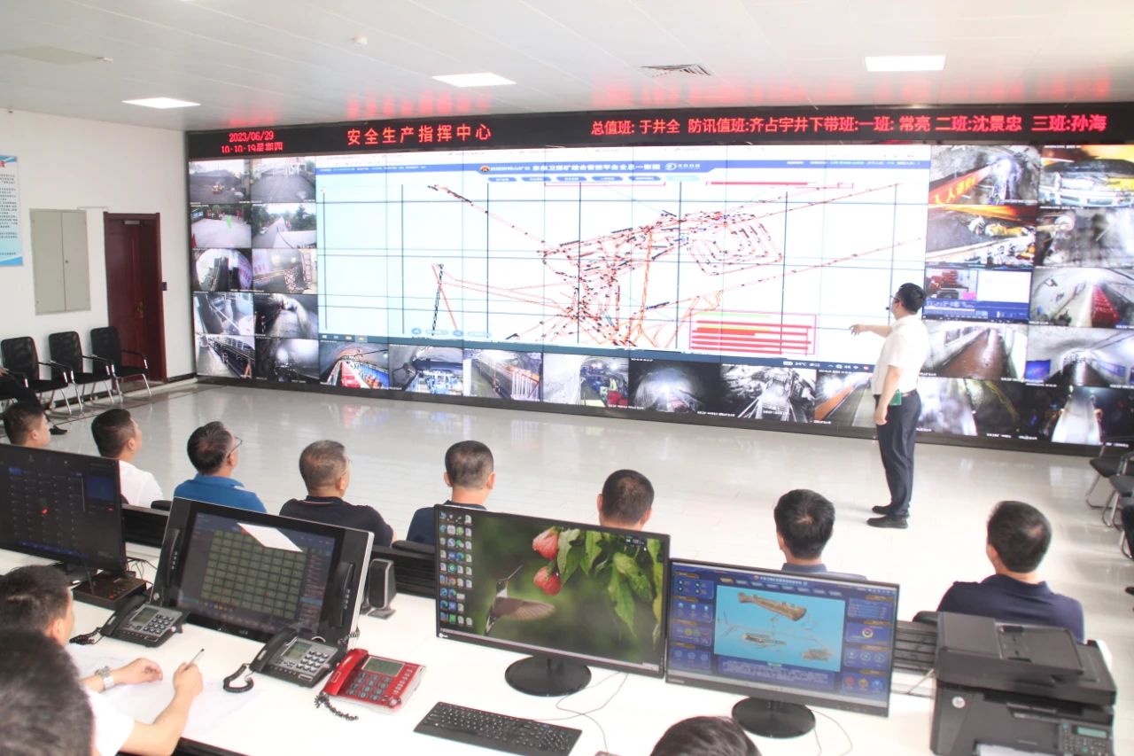 会前,与会人员观看了东保卫矿智能化建设专题片,听取了煤矿智能化示范矿井各子系统建设情况介绍,参观了安全生产指挥中心,并通过大屏幕详细了解《煤矿综合管控平台一张图》当中生产态势、安全双控、安全监测、人员定位、视频可视化、综合自动化等应用情况。