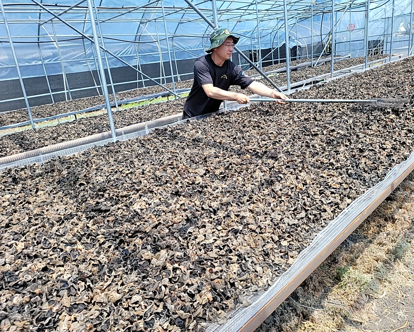 党委有号召,支部有响应,党员干部积极踊跃地参加到这次抢收黑木耳的义务劳动中来了。劳动中,每天7点30分,一排排私家车辆,载满了穿着迷彩工装的党员干部,准时到达七星绿色生态产业园。12人一组负责一个大棚,每人负责一条菌棒进行采摘。每组采摘快的党员干部,回过头帮助采摘得慢的同志,一个大棚采摘完了,就一起再支援没有采摘完的大棚。各组完工后,休息片刻就再重新分大棚采摘。每天中午就在大棚里吃简单的班中餐,吃完饭后,直接就进入大棚继续工作。天气炎热,大棚里更加闷热,党员干部全然不顾,每个人都是汗流浃背,手法娴熟地采摘木耳,一点都不能怠慢。大棚外由保卫科科长吴振龙领队的收晒木耳小组成员,穿梭于各个大棚之间,把采好的木耳装车运送到晾晒棚,铺好进行晾晒,劳动场面热火朝天。