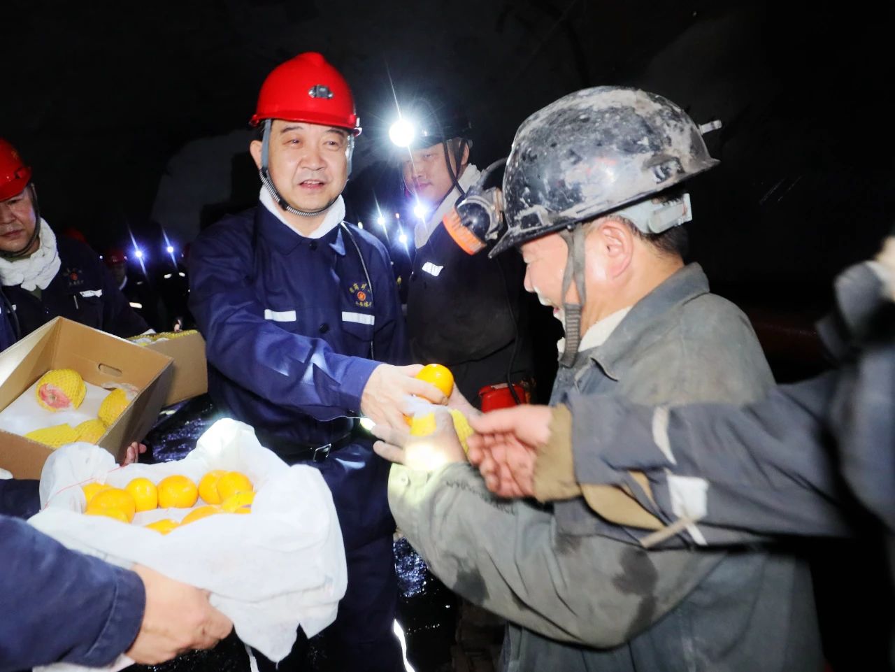 在兴安矿盾构机作业现场,刘鹏飞与一线职工亲切握手,并把苹果、金桔发放到当班职工手中。并亲切叮嘱他们,要时刻绷紧安全生产这根弦,按章作业,兑规生产,充分发挥现代化设备优势,提高进尺效率,夯实企业长远发展、高质量发展基础。