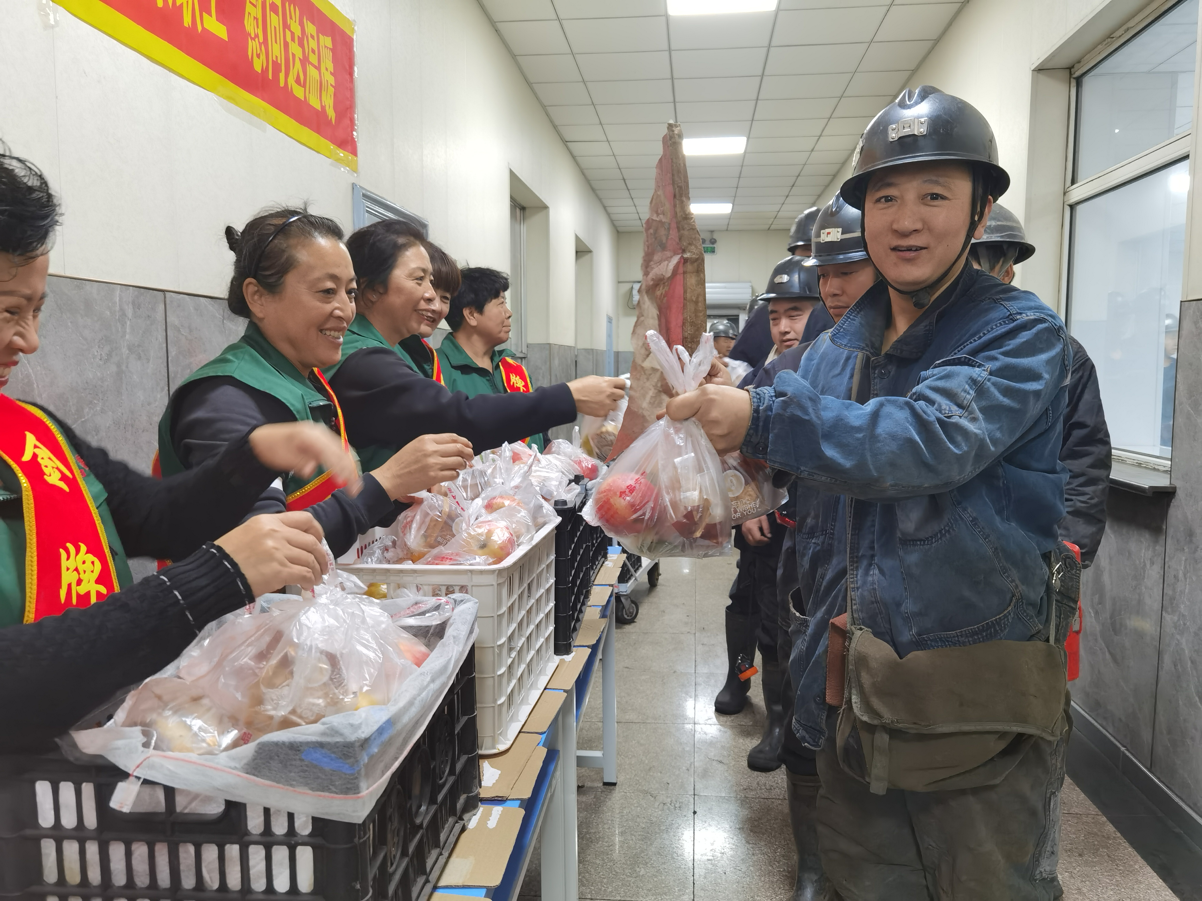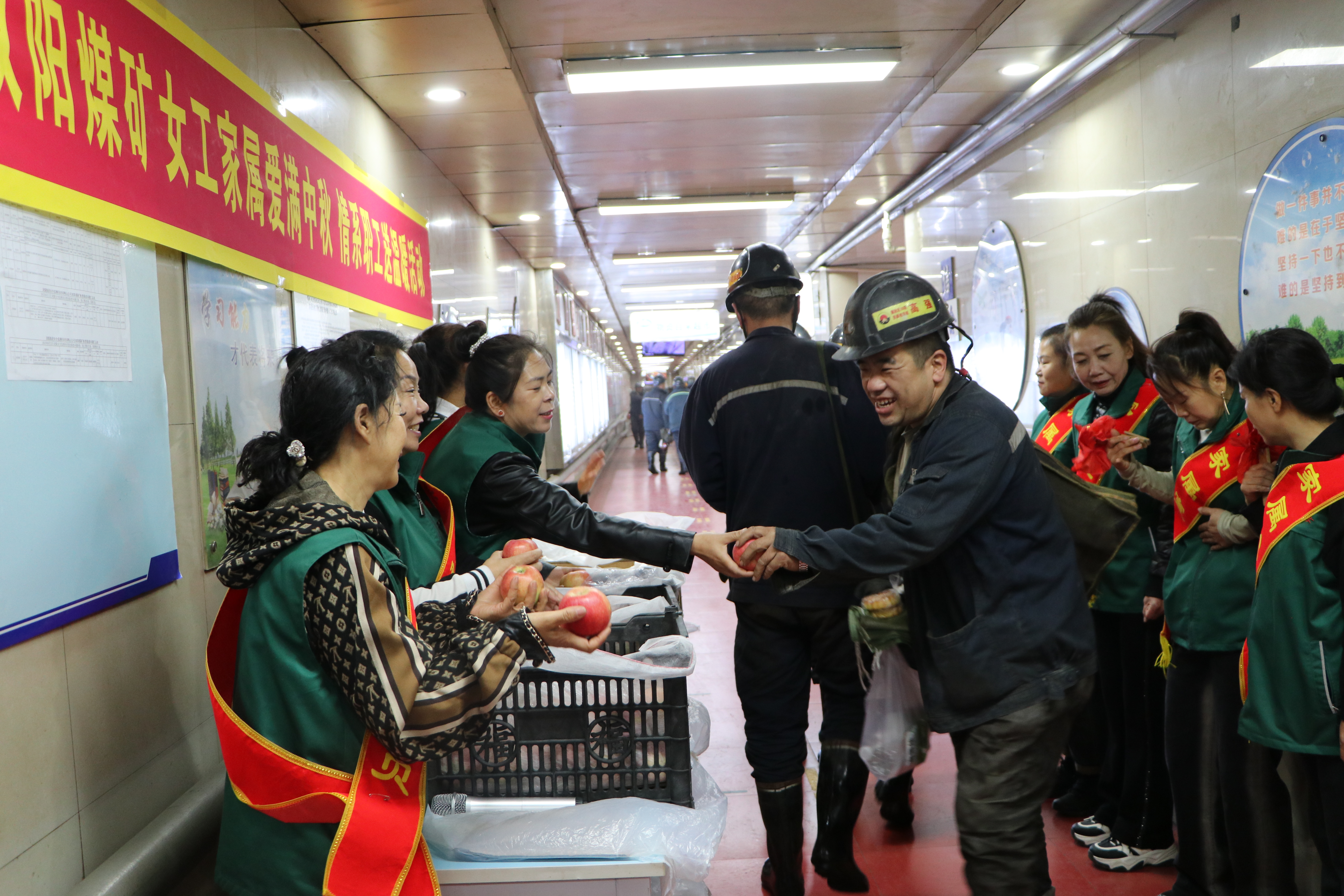 9月29日,家属协管员身披红色绶带,脸上洋溢着笑容,喇叭里放着热情的歌曲,说一声,“师傅,您辛苦了。”“中秋节快乐”“入井注意安全。”在慰问现场传来了女工家属协管员的一声声安全叮嘱和节日问候;红红的苹果,象征着平安健康,带着矿区家属满满的祝福;香甜的月饼,象征着家人团团圆圆,时刻提醒职工工作时想着家人的殷切期盼。