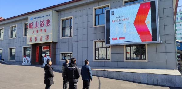 城山煤矿员工在LED屏前观看《条例》。