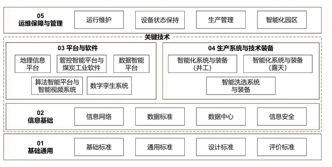 1.基础标准,主要包括术语和定义、煤矿智能化体系架构、煤矿工业互联网平台体系架构等方面标准。