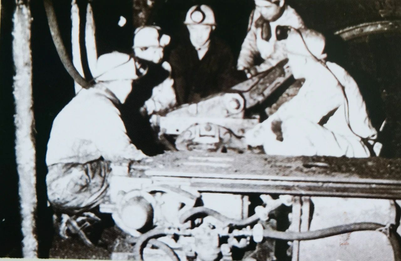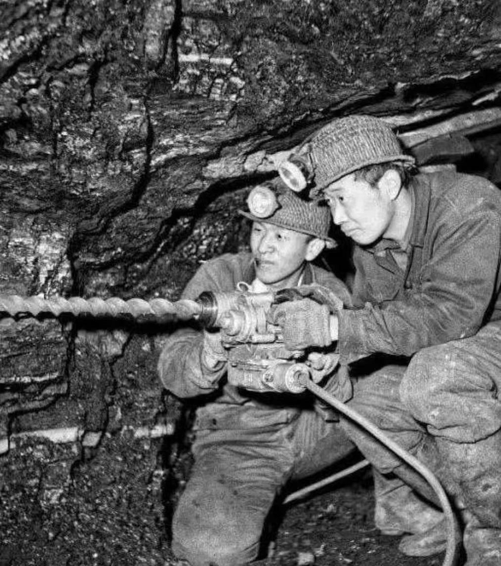 二十世纪50年代初,矿工在掘进生产时,用电钻打眼