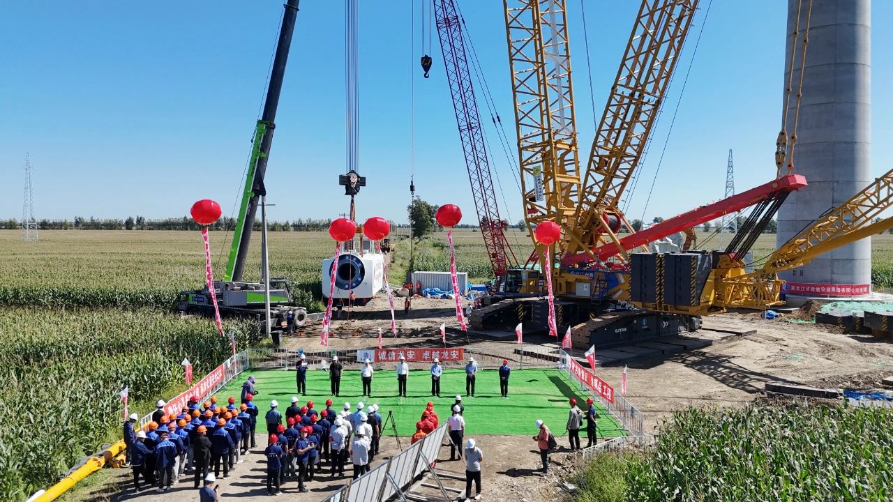 该项目位于双鸭山市集贤县境内,位列全省重点项目之一。项目占地约297平方公里,总装机容量200兆瓦,施工内容包括安装32台单机容量为6.2MW的风力发电机组,配套新建一座220千伏升压站。项目投运后,预计每年可产生清洁能源约7.4亿千瓦时,节约标准煤约23.67万吨。项目于2024年3月1日开始首台机组吊装,为推动施工进度,确保吊装作业顺利实施,项目指挥部联合施工单位、监理单位提前谋划、精心组织,多措并举,严格落实安全、质量、进度各项保证措施,积极协调内外部关系,克服严寒、阻工、地形分散等重重困难,历经186天夜以继日的奋斗,圆满完成了全部32台机组的吊装工作。