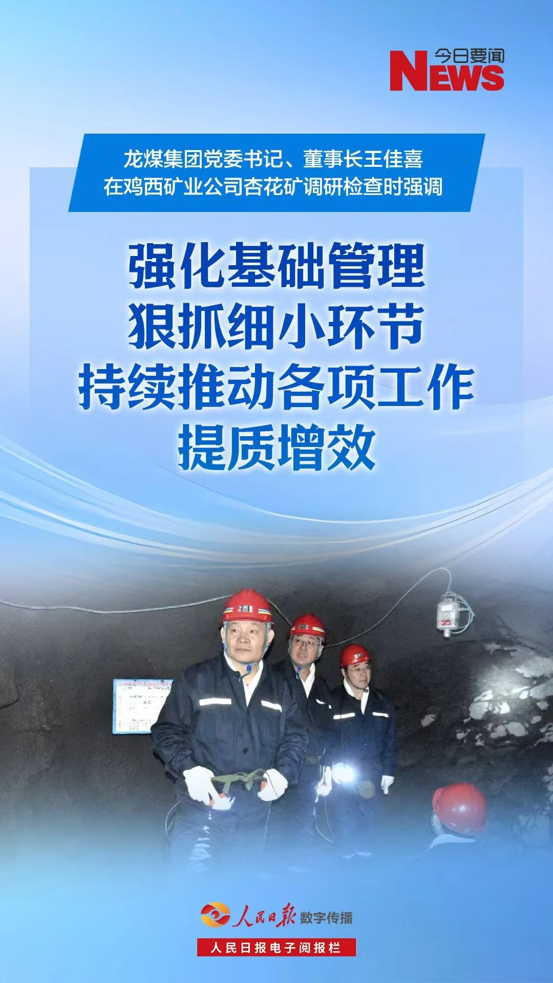 10月28日上午,集团公司党委书记、董事长王佳喜在鸡西矿业公司杏花矿调研检查时强调,要全面落实上级相关工作部署要求,切实增强抓好四季度安全、生产、经营工作的思想自觉和行动自觉,深入践行“细节决定成败”工作理念,于基础扎根、于细处着手、于实处发力,强化基础管理,狠抓细小环节,推动各项工作取得新突破、开创新局面,进一步夯实高质量发展基础。集团公司总工程师于会军参加。