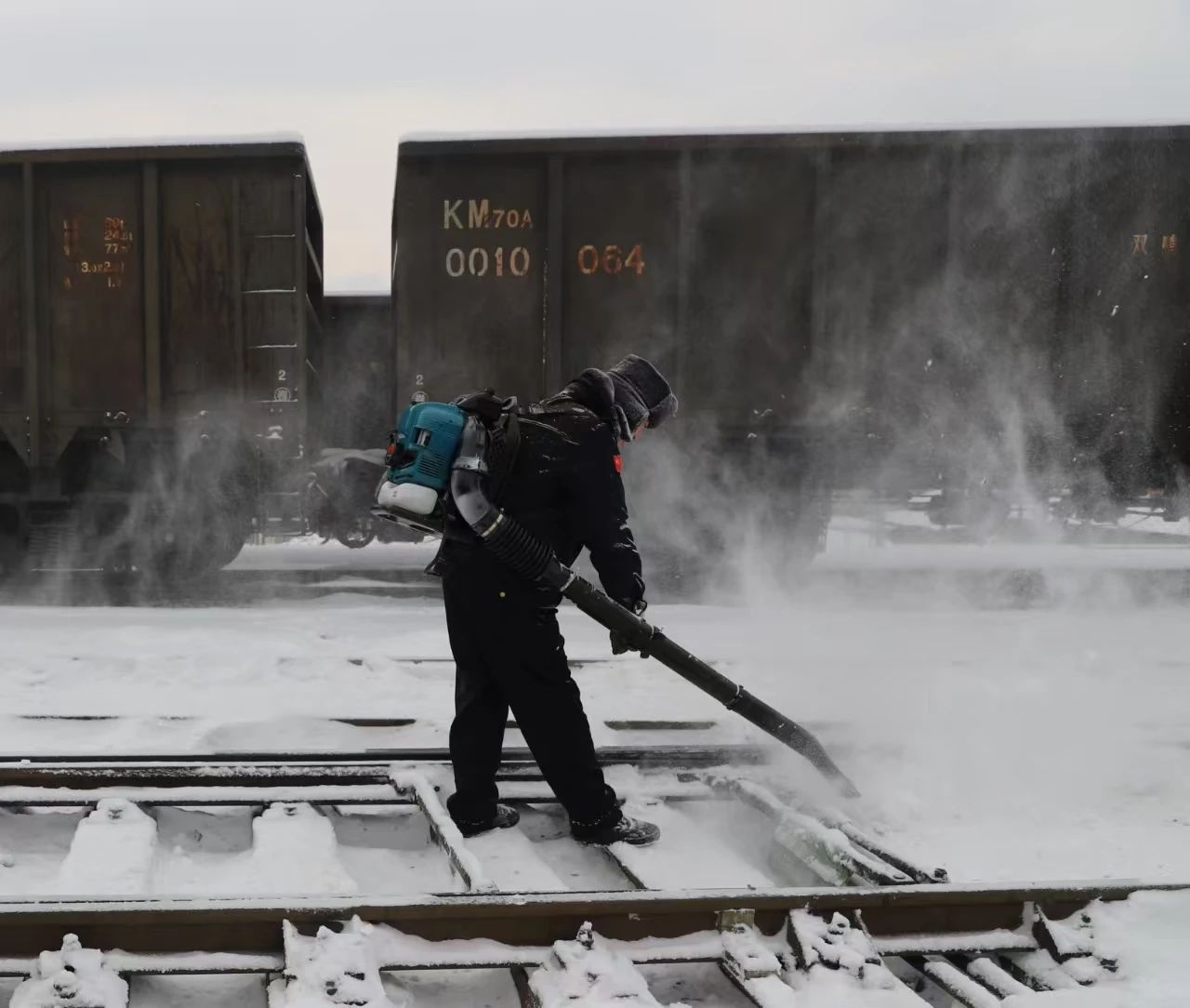 为应对低温雨雪冰冻天气,铁路运输部迅速启动应急预案,积极做好扫雪除冰和运输组织工作。车务、机务、工务、电务、车辆、机修等部门24小时值班值宿,做好行车指挥、设备维护、线路巡检、清雪除冰、安全防护等应急处置工作,合力筑牢运输生产安全屏障。特别对道岔、线路、信号设备等进行“地毯式”检查,对重点区域的积雪进行清扫,密切关注线路设备运行情况,采取人员提前到岗到位、增加除雪机具等方式,组织干部职工对受降雪影响线路开展全面巡查处置,确保重点区段行车设备状态良好。铁路运输部党委还组织党员清雪突击队,24小时坚守岗位,对厚的雪先用锹进行清理,再用吹风机清,喷灯铲子齐上阵,确保每个清雪单元有专人防护。经过连续奋战,随下随清,确保道岔无积雪冻冰,有力保证了运输畅通。