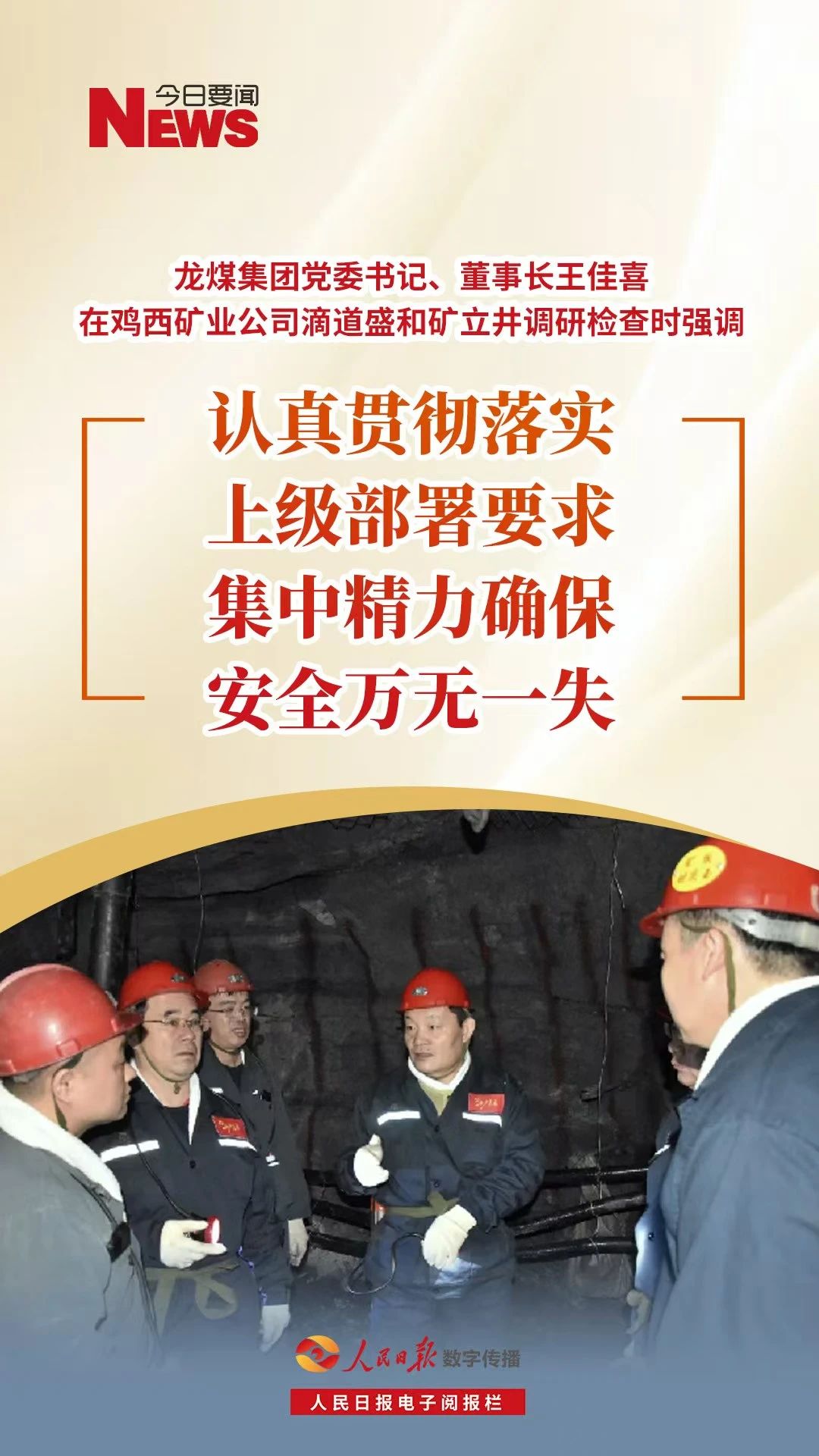 近日,beat365官方网站党委书记、董事长王佳喜在鸡西矿业公司滴道盛和矿立井调研检查工作时强调,要严格落实中共中央办公厅、国务院办公厅《关于做好2025年元旦春节期间有关工作的通知》有关要求,进一步提高对抓好岁末年初安全工作重视性认识,统一思想、锁定目标,集中精力、严抓细管,全力以赴做好矿井灾害治理及风险隐患排查整治有关工作,以实际工作质效确保2025年元旦、春节期间安全万无一失。
