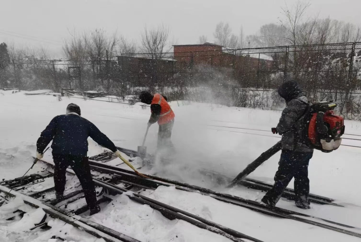 2月7日,大雪突降,电厂车站立即启动应急预案,站领导带队在车站负责的辖区内清理积雪。由于降雪量较大且持续时间长,他们迅速调整方案,将车站人员分成多个小组,轮流作业,每组由一名站领导带队,同职工一起奋战在铁路沿线,用实际行动担当起守护矿铁安全的职责。