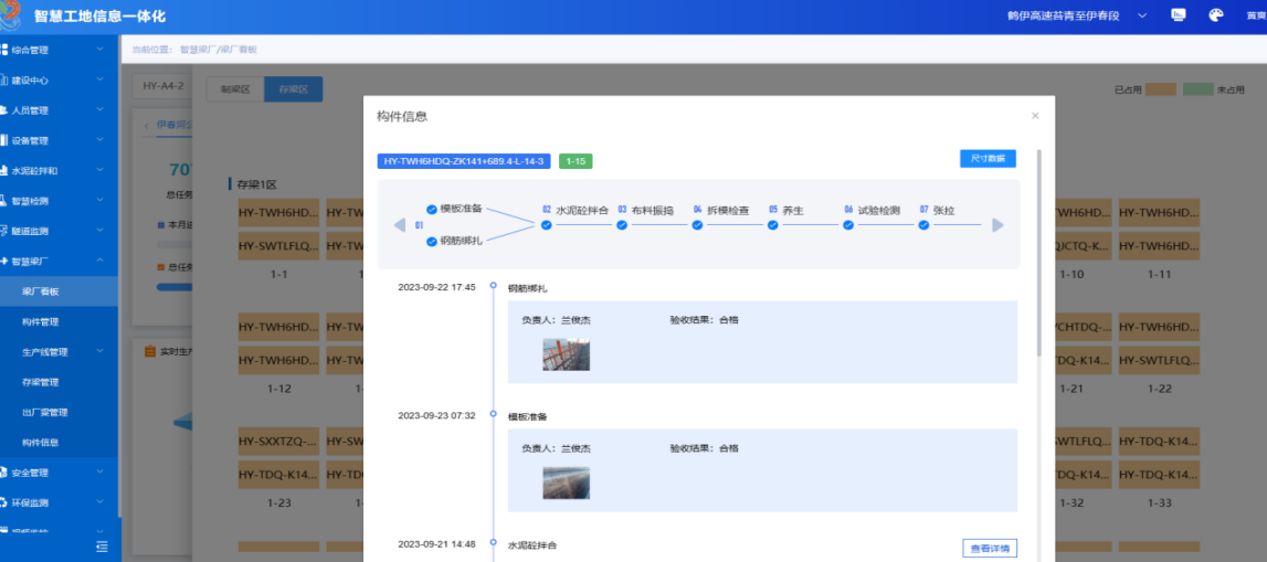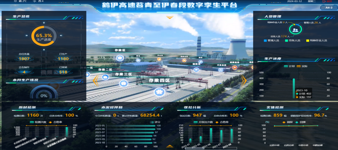 集团权属智慧梁厂通过孪生平台展示现场实际生产情况,直观了解生产情况,随时查看现场台座使用情况、预制构件生产工序,通过查看厂内的可视化云图,做到生产进度一目了然,生产质量信息环环相扣,实现规范化施工、标准化管理、可视化监管,减少过程中数据统计工作、巡查工作等,提升梁厂管理效率。