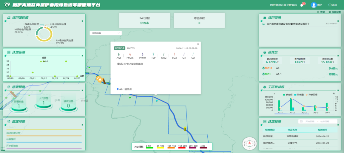 在绿色公路建设方面,打造省内首个开展施工期在线环境监测项目。一是通过前期环境背景调查,累计辨识项目绿色风险源133处,贯彻降本增效理念,优选环境高风险区域,累计建立了33处环境监测点,获取超过两万条监测数据,环境超标预警主动推送,实现足不出户管理施工现场环境。二是坚持全寿命周期理念,提出零污染两区三厂、全寿命绿色隧道、全过程低碳桥梁、低影响生态建设及零碳旅游服务区五大典型场景,具体落实隧道洞渣利用40.1万方、路基永临结合,减少林地占用15万㎡、珍贵树种移植4526棵、黑土地保护81.5万㎡等68项举措。