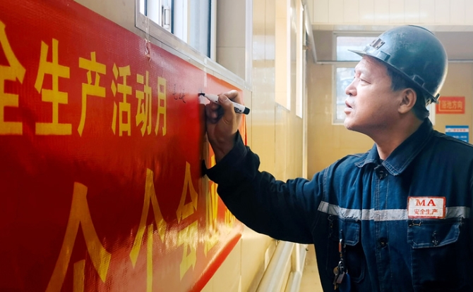 东山矿职工在安全生产承诺条幅上签名。 李雪摄